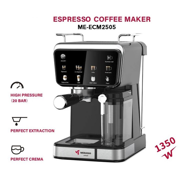 اسپرسوساز مباشی ME-ECM2505 مجهز به نمایشگر لمسی سینی چکه گیر، فناوری خاموشی خودکار، سیستم کلدبرو، قابلیت تولید فوم شیر و دو عدد نازل قهوه می باشد.