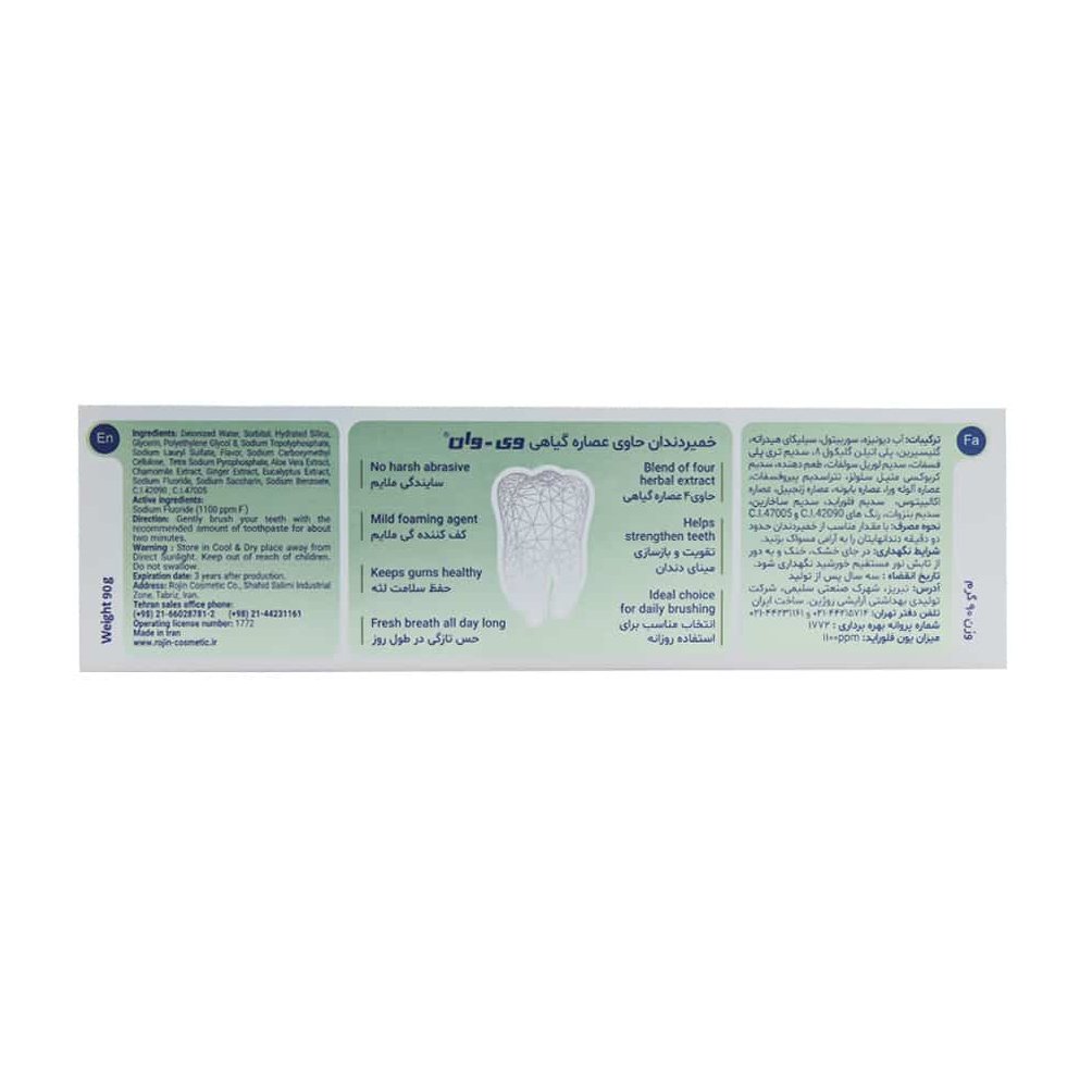 خمیر دندان وی وان گیاهی با عصاره های بابونه و زنجبیل، میکروبها را تا 12 ساعت مهار کرده، پلاک و حساسیت دندان را کاهش می دهد و دهان را خوشبو می سازد.