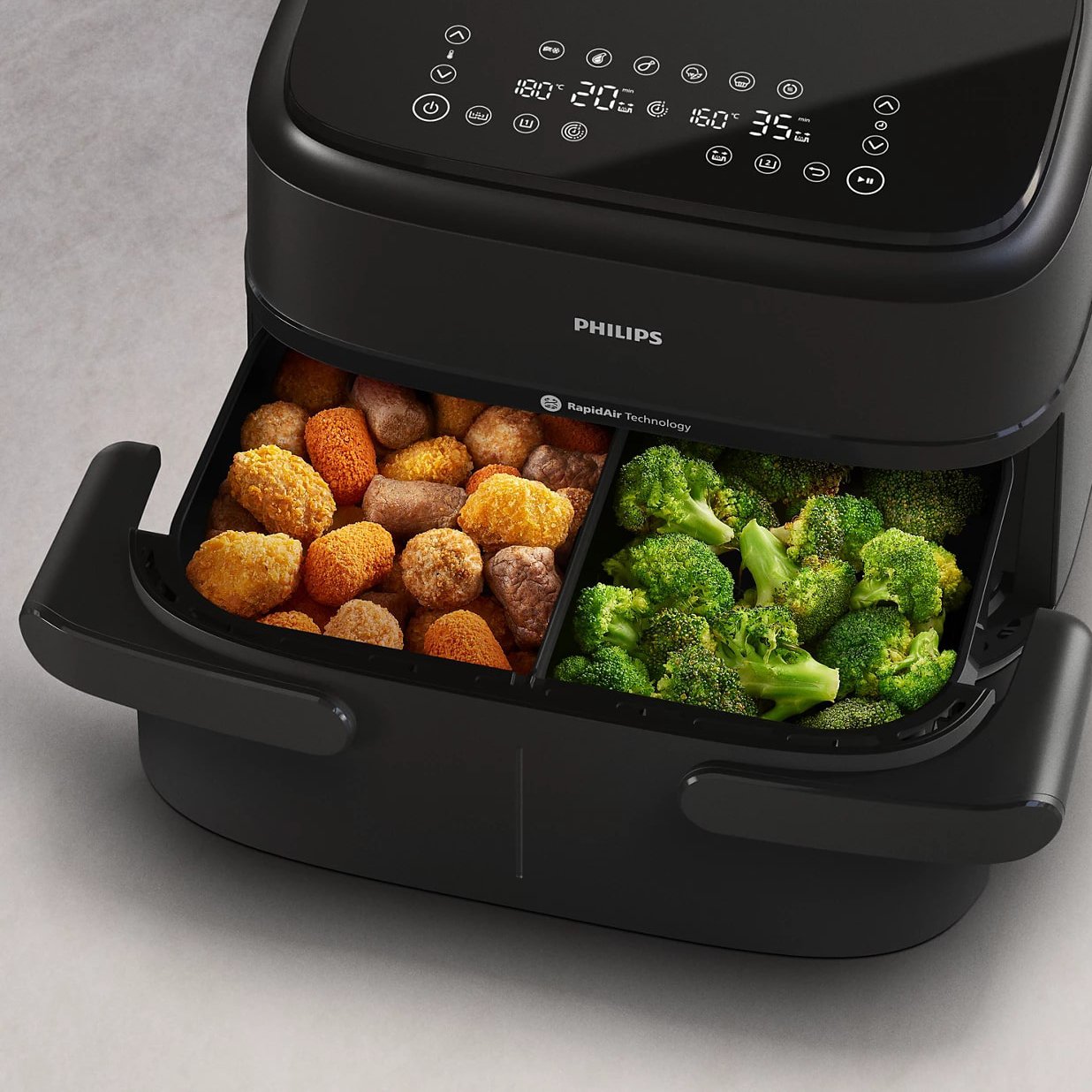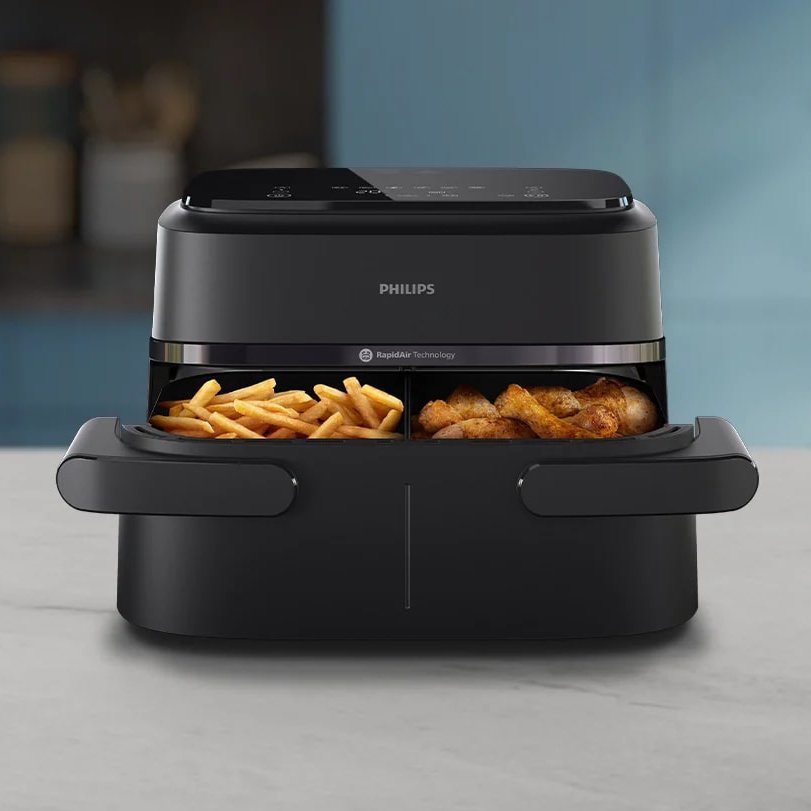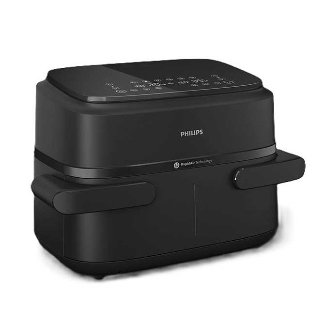 سرخ کن دوقلو فیلیپس 150 بدون روغن دارای 6 برنامه پخت شامل سرخ کردن بدون روغن، گریل کردن، پخت، گرم کردن مجدد، یخ زدایی و تهیه غذاهای نیمه آماده با تنظیمات دقیق و مستقل برای هر سبد بوده و کاربر می تواند حجم بالایی از مواد غذایی را مانند سیب زمینی، مرغ، ماهی، گوشت، سبزیجات، کیک و … به سالم ترین شیوه پخت نماید. گفتنی است که مخزن این سرخ کن به صورت یکدست طراحی شده و این امکان فراهم است تا در صورت نیاز کاربر بتواند برای پخت همزمان مواد غذایی و تسریع روند آماده سازی غذا بدون ترکیب طعم ها، محفظه را به دو قسمت مجزا تقسیم نماید.