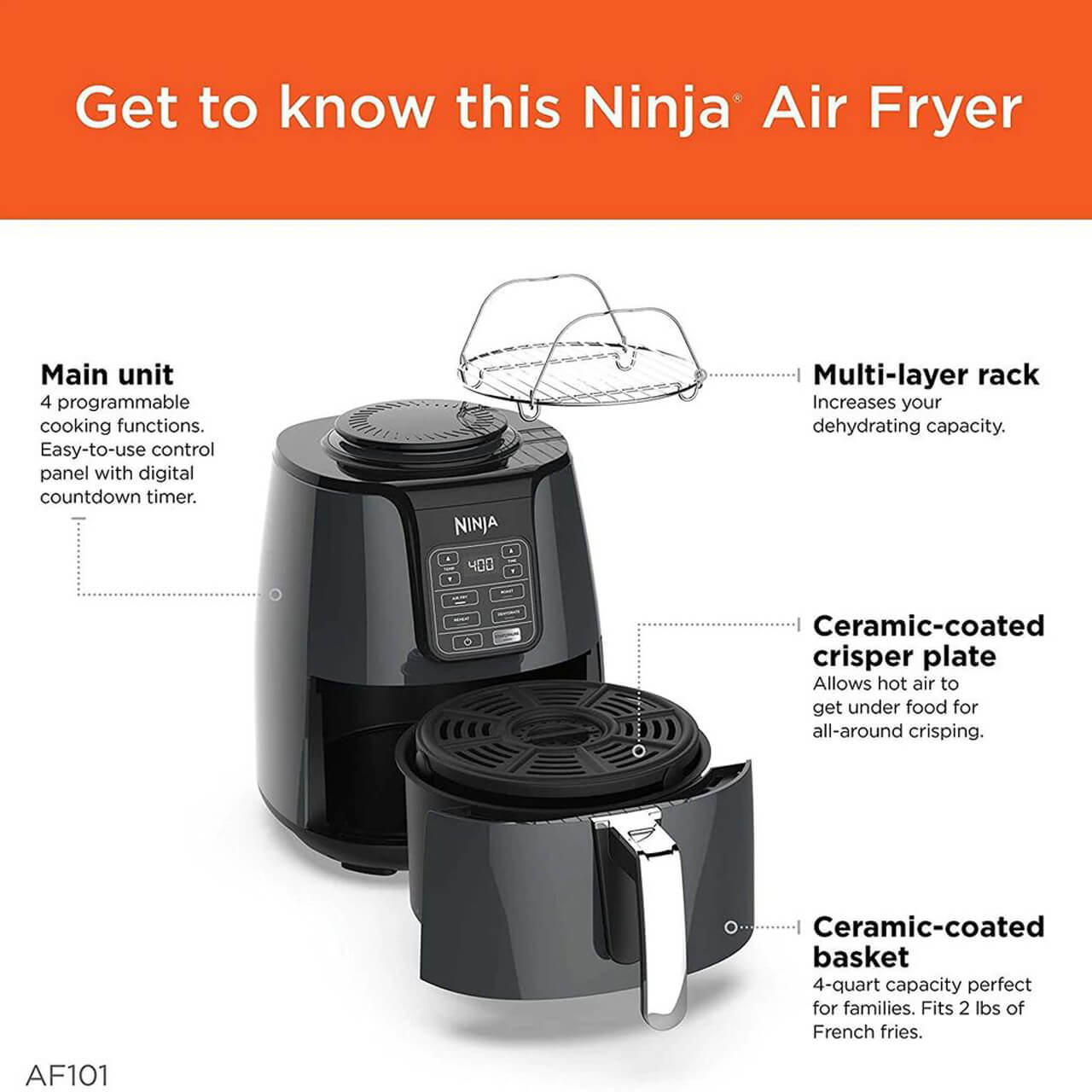 سرخ کن نینجا AF100 با گنجایش 3.8 لیتری، دارای 4 برنامه سرخ کن، کباب، گرم کردن و میوه خشک کن است و امکان پخت حدود 900 گرم سیب زمینی سرخ کرده را به شما می دهد.