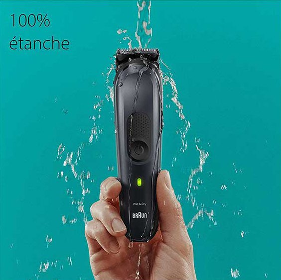 یکی از مهم ترین ویژگی های ست ماشین اصلاح براون مدل MGK7491 خاصیت ضد آب آن است تا کاربر بتواند از آن در زیر دوش حمام و یا هنگام استفاده از فوم یا ژل استفاده نماید و از ریش، صورت و گوش تا اصلاح بینی، اصلاح بدن و آرایش صورت را به طور کامل و با بالاترین کیفیت انجام دهد. تکنولوژی AutoSense نیز هر چند ثانیه یکبار میزان تراکم ریش را اندازه می گیرد و قدرت موتور را بر اساس آن تنظیم می کند.