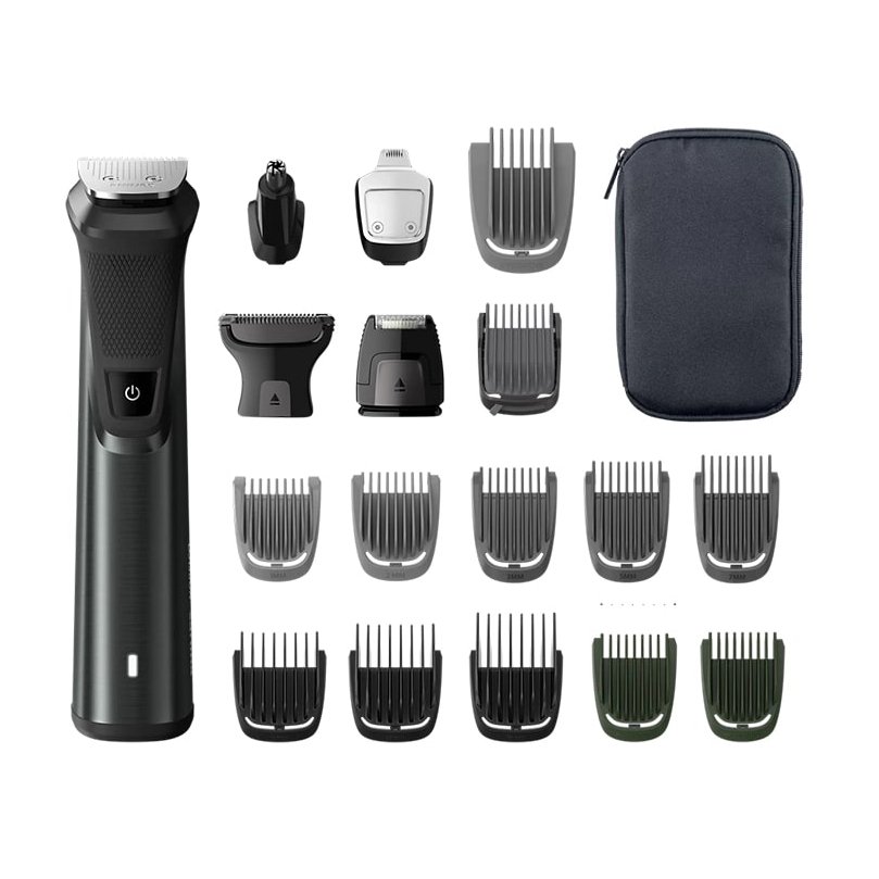تریمر پرستیژ همه کاره – طراحی ارگونومیک – دسته استیل ضد زنگ با گریپ لاستیکی – ولتاژ 100 تا 240 ولت – باتری لیتیوم یون – تیغه خود تیز شونده با فناوری Dual Cut – سنسور Power Adapt – مجموعا 21 تکه برای اصلاح سر، صورت و بدن : تریمر استیل، تیغ فویلی، تریمر استیل مخصوص جزئیات، تریمر بینی و گوش، اصلاح کننده بدن با محافظ پوست، 3 شانه مو، 3 شانه ریش، 2 شانه ته ریش، شانه ریش قابل تنظیم، شانه ابرو، 2 شانه بدن – کیف نگهدارنده – برس تمیزکاری – کابل شارژ – بدون نیاز به روغن کاری – نشانگر شارژ و باتری ضعیف |