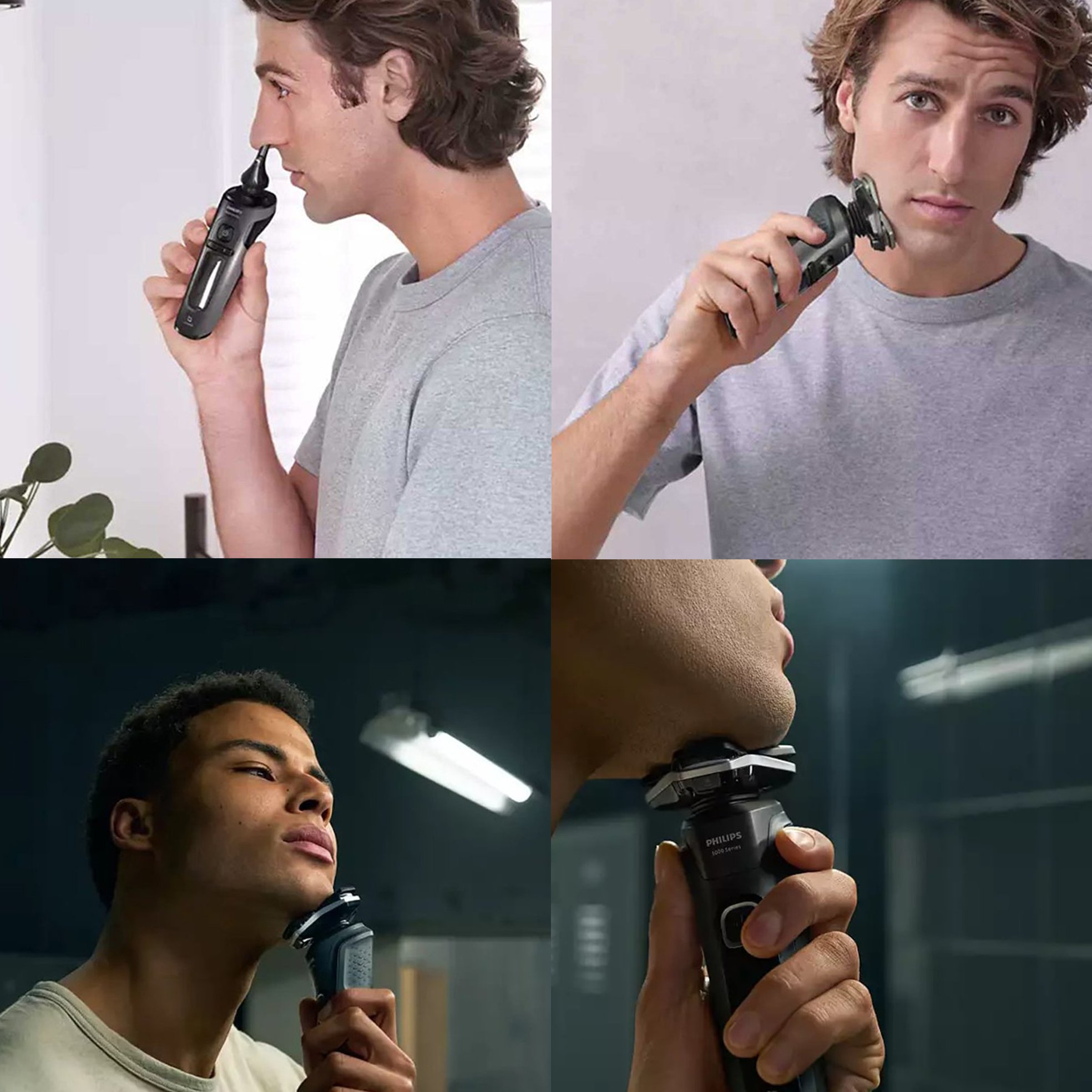 ماشین اصلاح فیلیپس S5898/38 دارای عملکرد برش چرخشی، ضدآب، 45 تیغه خودتیزشونده، باتری Li-Ion با شارژ سریع 5min، تریمر بینی و گوش، سنسور Power Adapt و SkinIQ است.