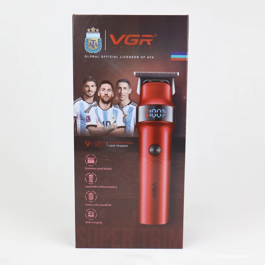 نمایشگر LED روی بدنه در ماشین اصلاح 987 وی جی آر برای اطلاع کاربر از میزان شارژ باقیمانده باتری تعبیه شده و دستگاه با مجهز بودن به موتور قدرتمند قادر است موهای ضخیم را به آسانی و در مدت کوتاه کوتاه نماید. تکنولوژی تریم نیز جهت خط زنی ریش، سبیل و پشت گردن و به طور کلی تکمیل فرآیند اصلاح در این محصول قرار گرفته است و کاربر می تواند اصلاحی حرفه ای و نتیجه دقیق تر با عملکرد توربو Turbo، که وظیفه افزایش لحظه ای سرعت را عهده دار است، داشته باشد.