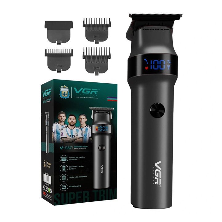 ماشین اصلاح وی جی آر VGR V-987 به باتری Li-Ion قابل شارژ، عملکرد توربو، تیغه استیل، نمایشگر LED، عملکرد تریم، تکنولوژی برش مستقیم، صفر زن و خط زن مجهز است.