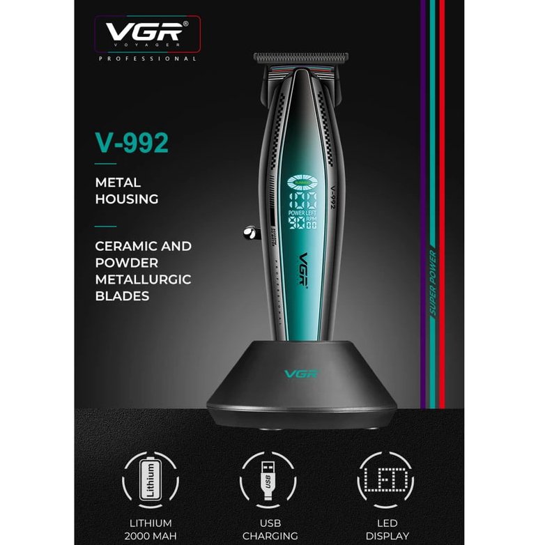 ماشین اصلاح وی جی آر VGR V-992 دارای سرعت موتور 9000rpm، باتری Li-Ion قابل شارژ، نمایشگر LED، تیغه سرامیکی DLC، باتری لیتیوم یون 2000mah، صفر زن و خط زن است.